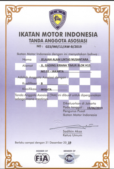 PT. Jelajah Alam Lintas Nusantara, berbadan hukum resmi dan merupakan anggota IMI dan IOF